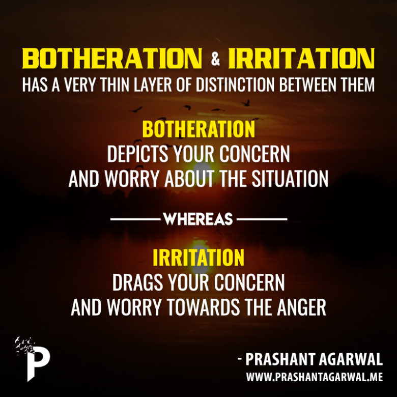 Botheration has positive connotation attached with it whereas irritation is negative in every aspect. When you bother about a matter, it shows your concern towards it. You are still in a position to find an effective solution. On the other hand, irritation profuse your mind with anger and anxiety thus only aggravating the situation.