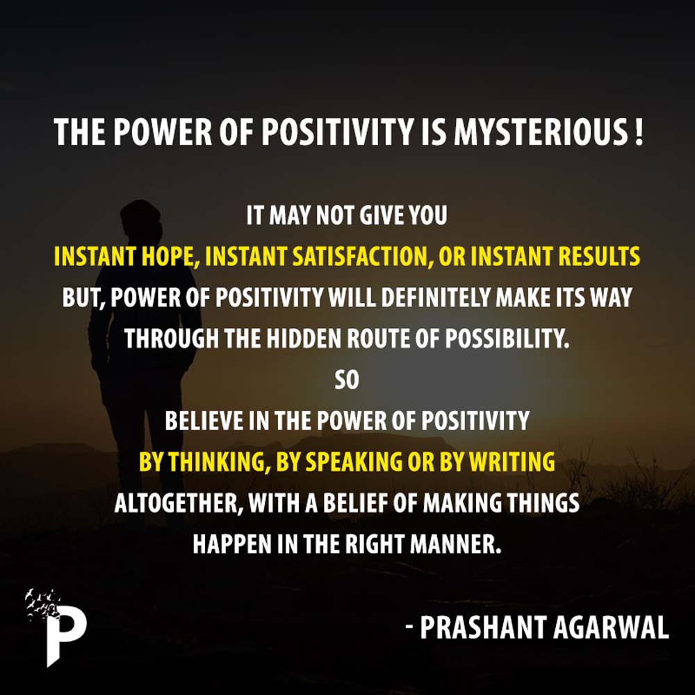 Positivity immediately comes into action, though it may not show up the results. But sooner or later, you would see, the light of positivity take away the gloomy clouds from your life. It gives you a hope to pursue your dream with hard work, makes you resilient when life knocks you down and makes you believe in self, when rest of the world doubts your capabilities.